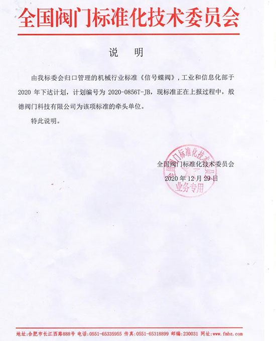 今天是2020年的最后一天,般德閥門再獲殊榮,成為機械行業(yè)標準《信號蝶閥》的牽頭單位,國家標準《工業(yè)閥門的逸散性試驗》、《通用閥門 不銹鋼鑄件技術(shù)條件》、《鐵制和銅制螺紋連接閥門》、《工業(yè)閥門 壓力試驗》四項標準的起草單位之一。