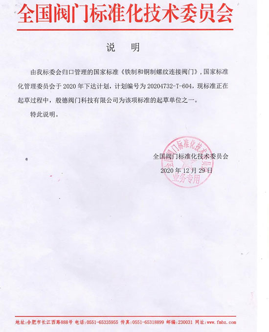 圖|般德閥門為國家標準《鐵制和銅制螺紋連接閥門》起草單位之一