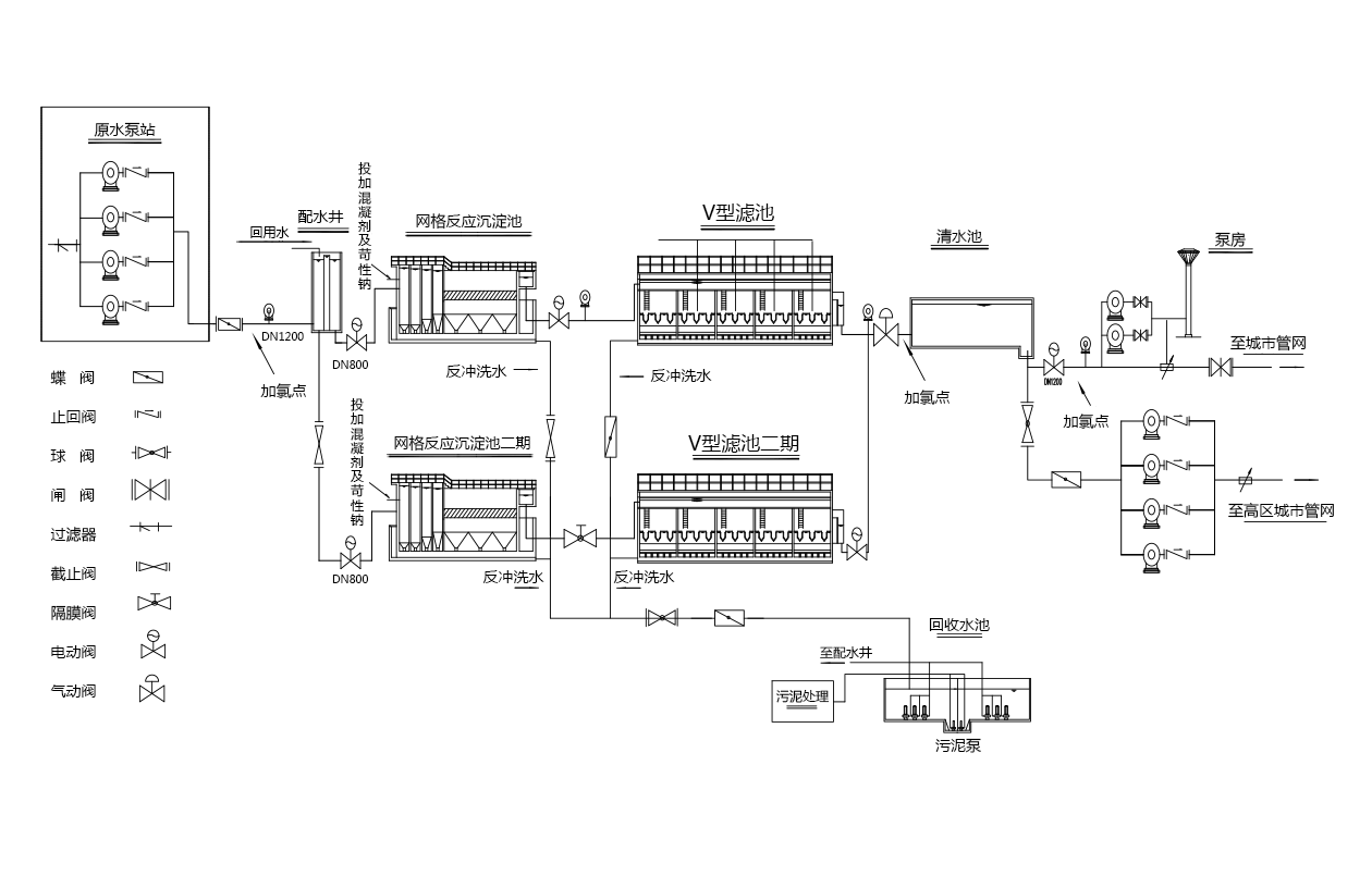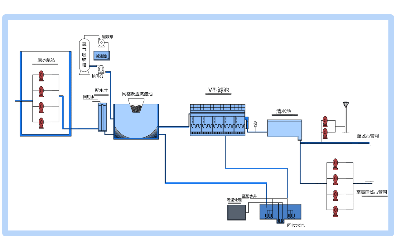 原水經(jīng)取水泵房提升后,首先經(jīng)過混凝工藝處理,即:原水+水處理劑→混合→反應(yīng)→礬花水,經(jīng)混凝反應(yīng)處理過的水通過管道流至沉淀池。混凝階段形成的絮狀體依靠重力作用從水中分離,其中顆粒沉入池底,污泥不斷堆積濃縮,定期排除池外。過濾一般用石英砂等有空隙的粒狀濾料層通過黏附作用截留水中懸浮顆粒,從而進一步除去水中細小懸浮雜質(zhì)、有機物、細菌、病毒等,使水澄清的過程。濾后繼續(xù)加氯消毒,最后水進入清水池,再經(jīng)泵房加壓后通過配水管道送至千家萬戶。
